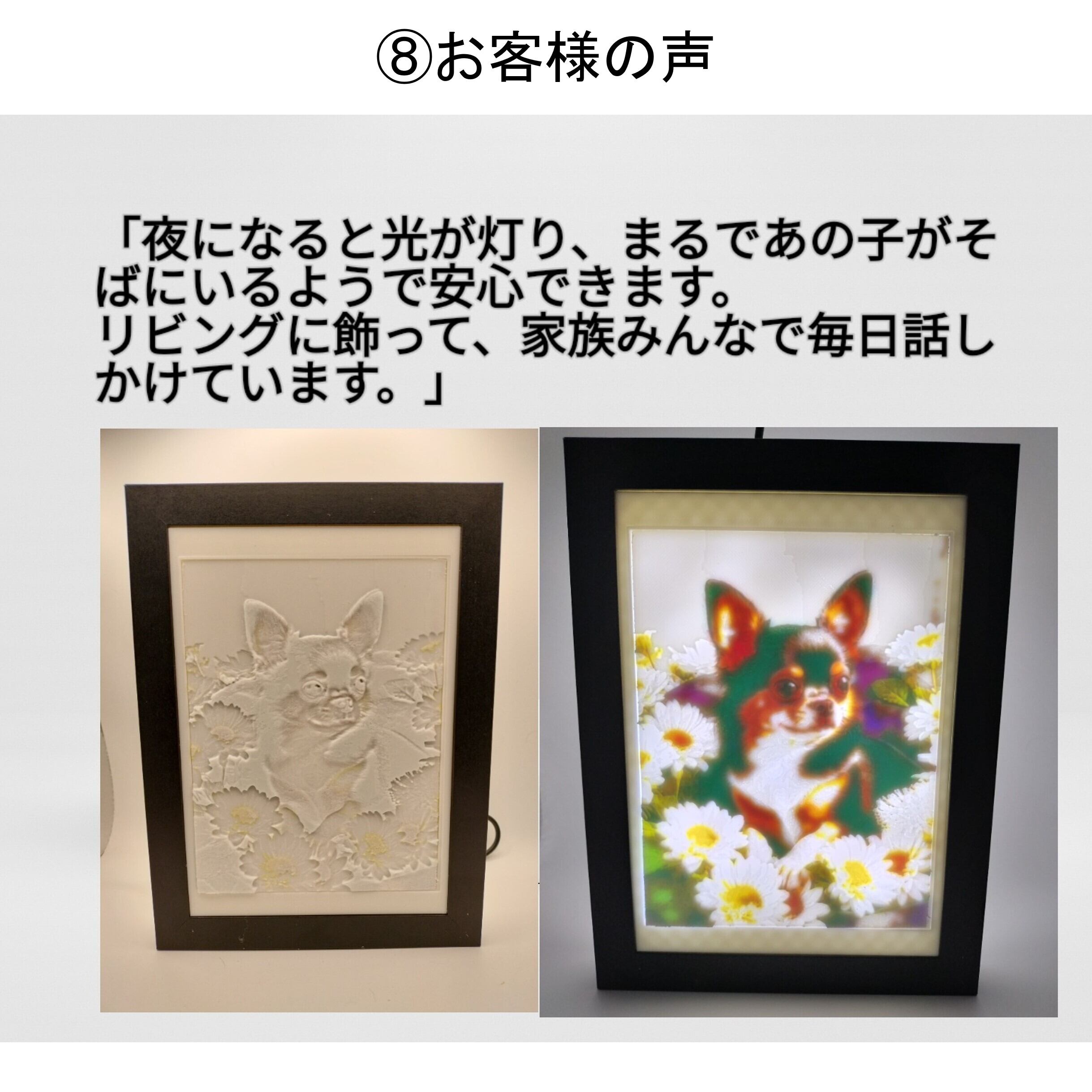 犬・猫・小動物など、どんな大切な存在でも、その姿を光の中に美しく浮かび上がらせます。
